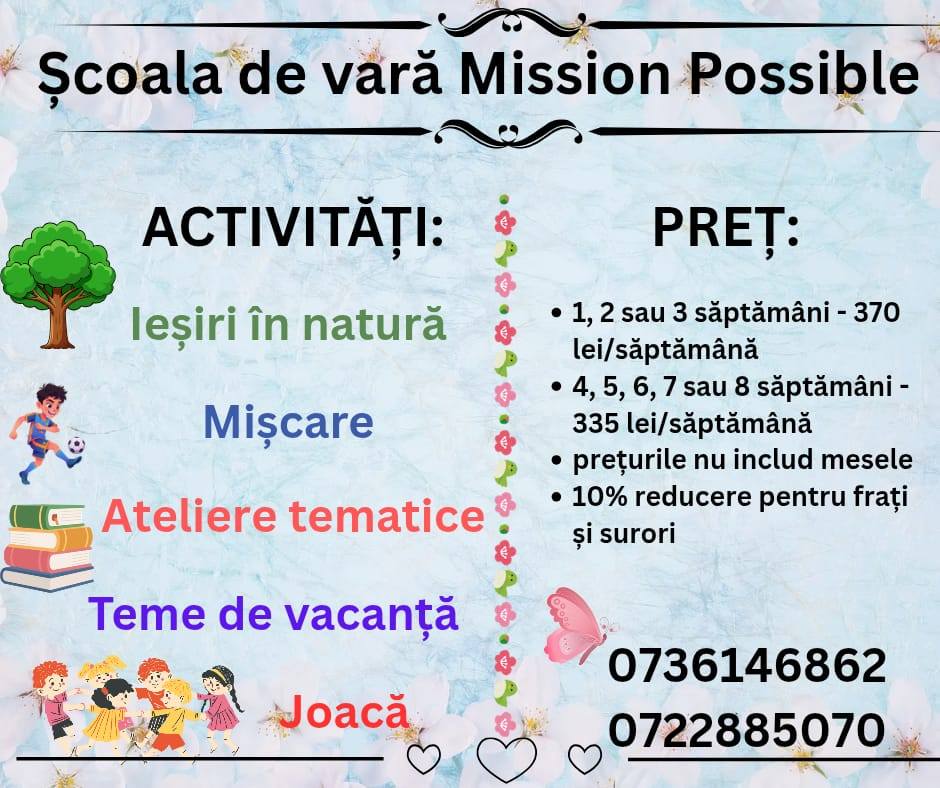 La Mission Possible Sibiu, scopul principal este bucuria copilului dumneavoastra.Cu peste 10 ani de experienta in afara Romaniei la care se adauga cei 2 ani de experienta in tara, personalul nostru aduce cu sine cunostinte bogate despre nevoile si personalitatea copilului. Conceptul cheie pe care se bazeaza intreaga noastra activitate la Mission Possible este: "nu imbatranesti atunci cand trec anii, ci imbatranesti atunci cand uiti sa fii copil". In baza acestei filozofii simple, noi urmarim in permanenta sa avem o atitudine bazata pe intelegere, respect si rabdare, cu multe zambete si voie buna. Scopul nostru nu este doar de a supraveghea. Noi vrem sa ajutam fiecare copil sa isi descopere potentialul, talentul si abilitatile.